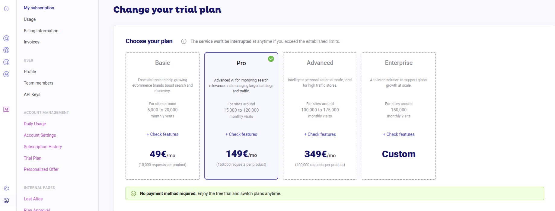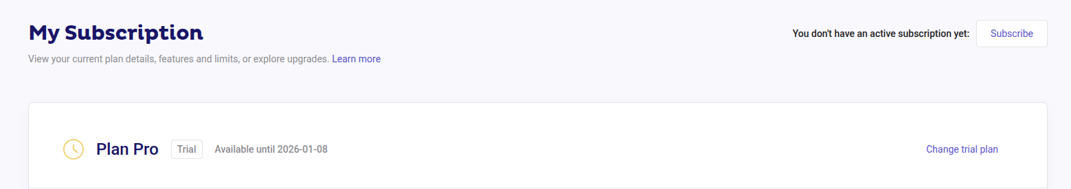 If you decide to subscribe to a plan before the trial ends, click on the “Subscribe” button on the top right-hand side, or wait until the trial ends. Until then, nothing will be charged. If you click on “Subscribe”, you will be automatically redirected to the purchase flow. The remaining trial days will stay unchanged.