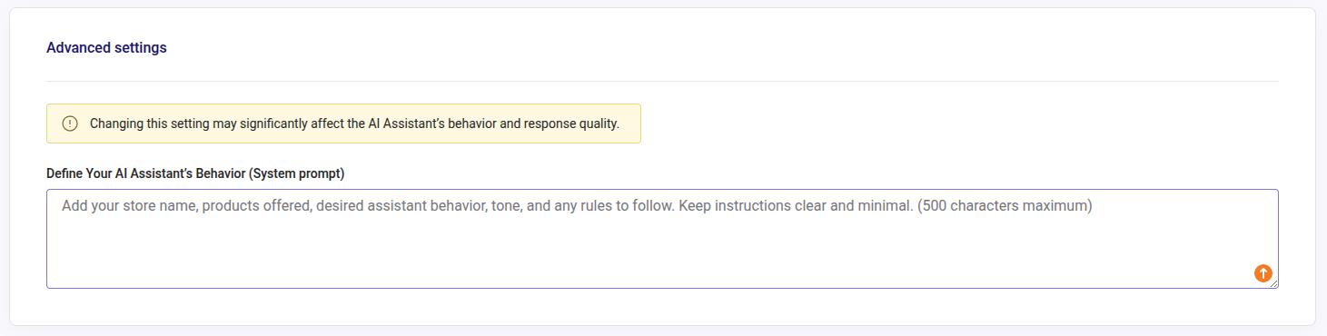 Here you can add basic information about your store to help the assistant to answer questions about your business, shaping how the assistant responds. However, it is not necessary to modify or add information in this field for the assistant to function properly. Our recommendation is to leave it blank at first: test the assistant with your current setup and only add information here when you need to correct or refine its behavior. Keep in mind that any changes will affect all responses and, if not carefully written, may reduce quality or lead to unexpected behavior.