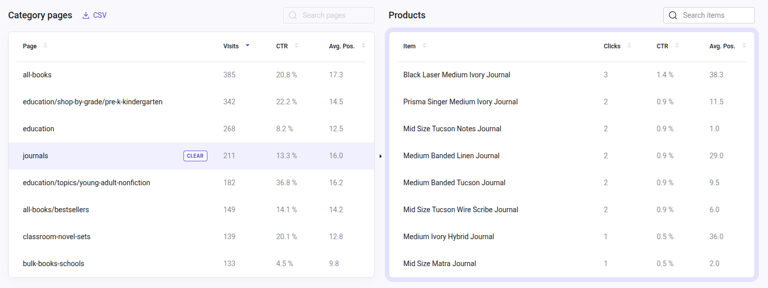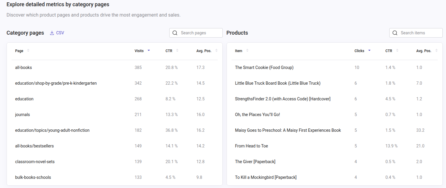 | Average position of clicked results | Average position of products users click on. | - Previous period. - 5-month average. - How far users need to scroll before finding something worth clicking. |
