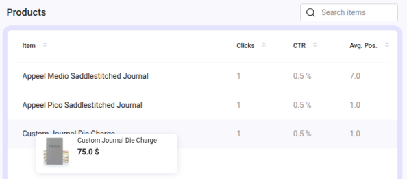 In the secondary table called Products, you will see all products from that Category page previously hovered over. Now, hovering a product will show a tooltip with a summary of the product: