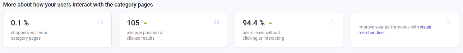 | % of users leaving without interaction | Balance of the Category page visits without clicks and total category page visits. | - Previous period. - % of times users visited a category page but left without clicking on any result. High value may indicate irrelevant items or poor ranking. |