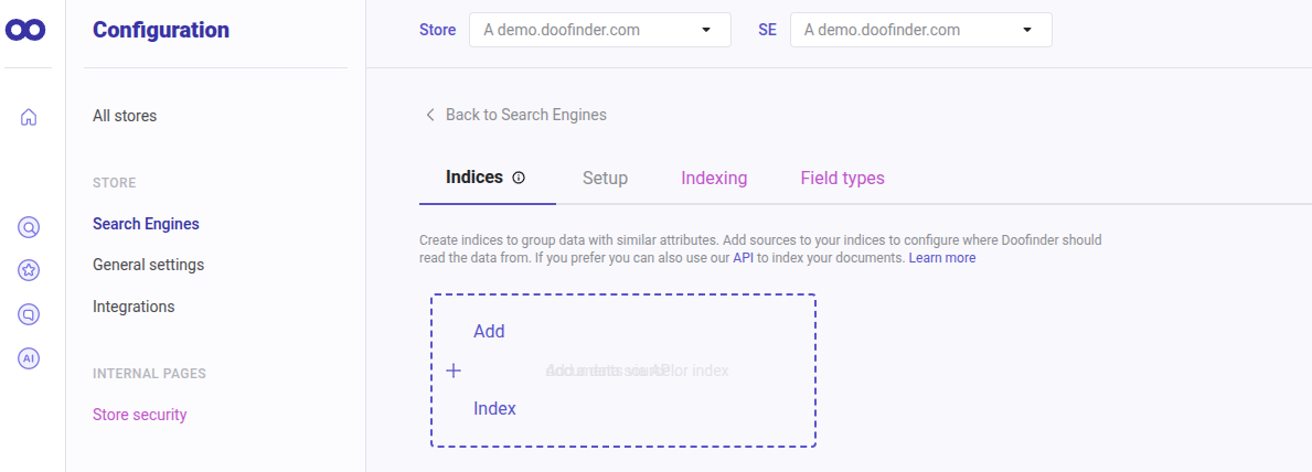 - To add a data feed source, go to your Admin Panel > Configuration > Search Engine > Indices.